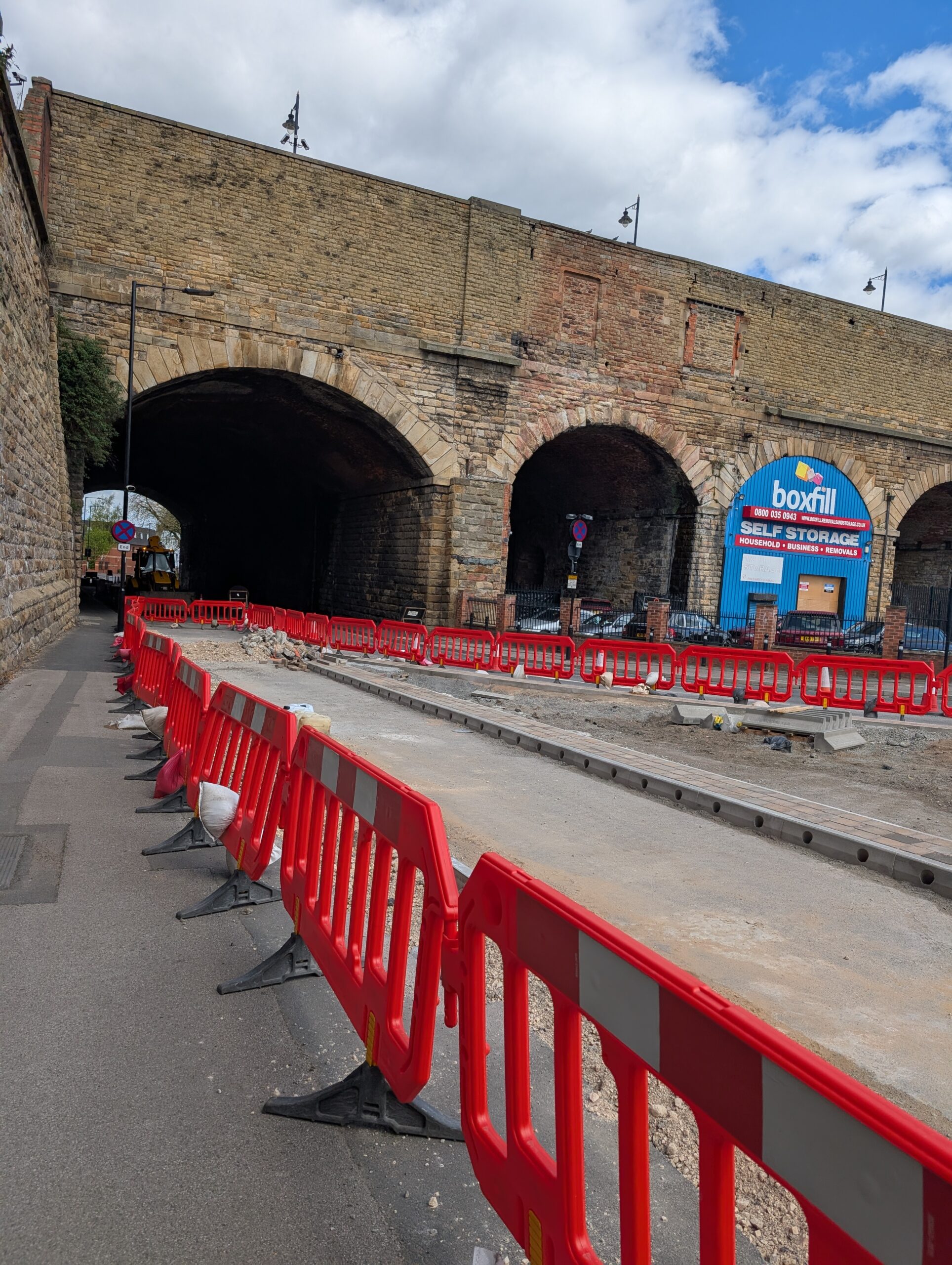 On Arundel Gate, work continues on creating a roundabout to aid drivers to avoid the bus gate. Seemingly no work has started on the cycle track here yet.