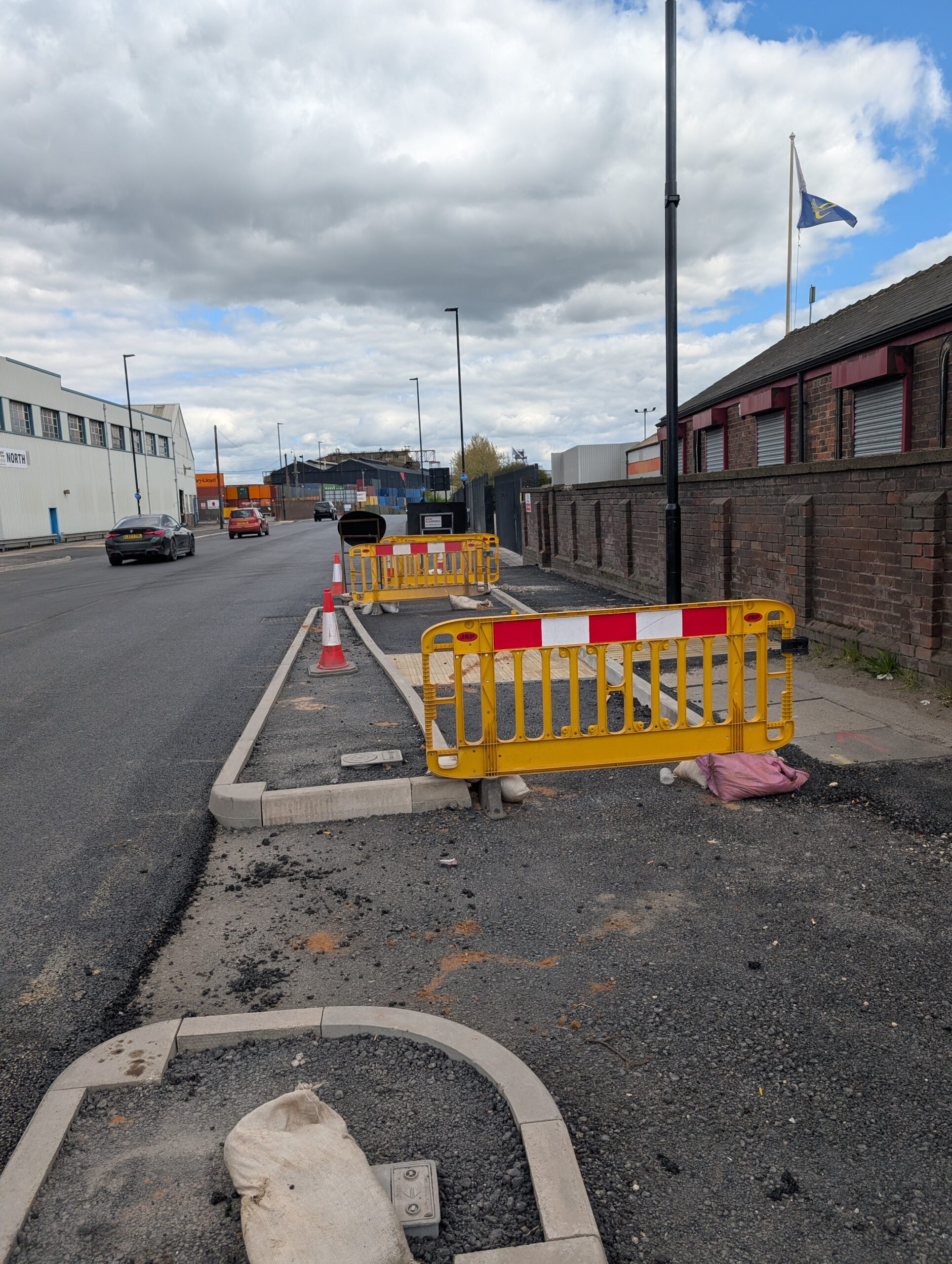 Work continues on adding a cycle track to Furnival Road, crossing Derek Dooley Way.